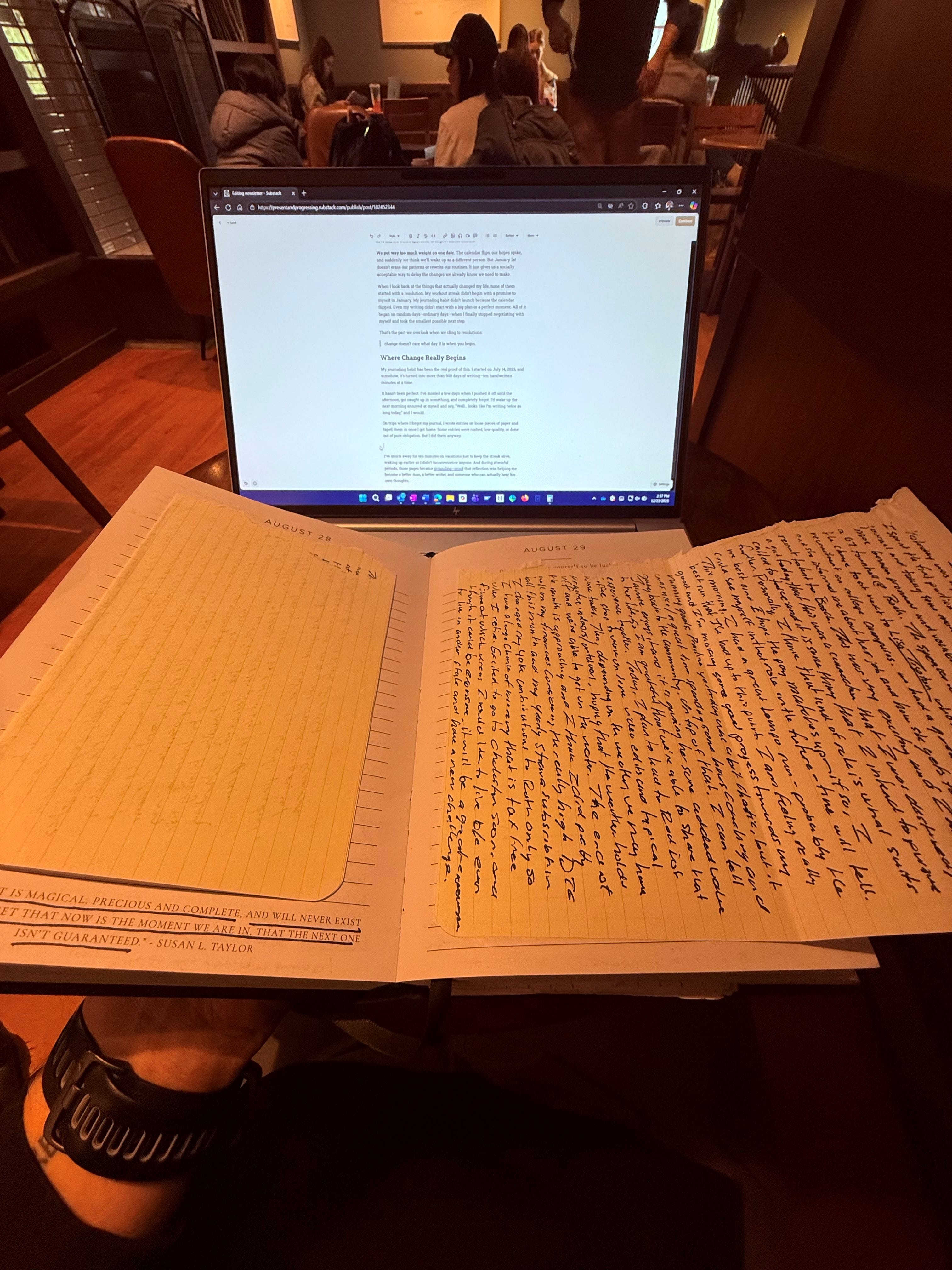 I’ve snuck away for ten minutes on vacations just to keep the streak alive, waking up earlier so I didn’t inconvenience anyone. And during stressful periods, those pages became grounding proof that reflection was helping me become a better man, a better writer, and someone who can actually hear his own thoughts.