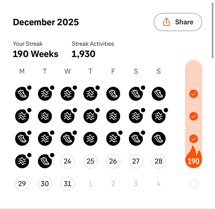 The streak never came from motivation or from some dramatic turning point. It came from doing what I said I would do, even when it was not convenient. Over time, that consistency became less about fitness and more about identity. It became proof that I can trust myself to follow through.